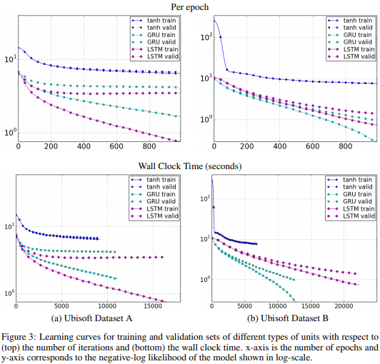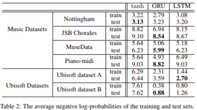 각 데이터에 대해 tanh-RNN, GRU, LSTM 을 사용한 모델들의 성능을 비교했다. 모델 설계시 unit수를 조절해 최대한 유사한 parameter 수를 갖도록 설계했다. Overfitting을 방지하기 위해 충분히 작은 규모의 모델을 구축했고 negative log-probabilities 를 평가지표로 선정해 성능을 평가했다.