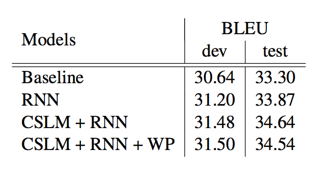 결과적으로 CSLM+RNN 모델이 가장 높은 BLEU score를 보였으며 RNN 역시 baseline보다 더 높은 score을 산출했다. 이것은 CSLM과 RNN이 서로 correlated 되지 않고 독립적으로 성능을 향상에 기여하고있다는 것을 의미한다. 추가적으로 word penalty를 적용했을때는 test score가 약간 감소했다.
