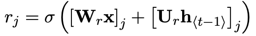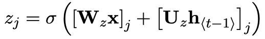 위 수식은 j번째 hidden state의 Reset gate와 Update gate를 계산하는 식을 나타낸다. σ는 logistic sigmoid activation function, []j는 j-th element of vector를 의미한다. Wr와 Ur는 각각 weight, x와 h⟨t-1⟩은 input과 이전 hidden state를 의미한다. Reset gate는 input x에 weight인 Ur을 곱한 값과, 이전 hidden state인 h⟨t-1⟩에 Ur를 곱한 값을 더해 sigmoid function에 넣어 구한다. Update gate 역시 동일하다.