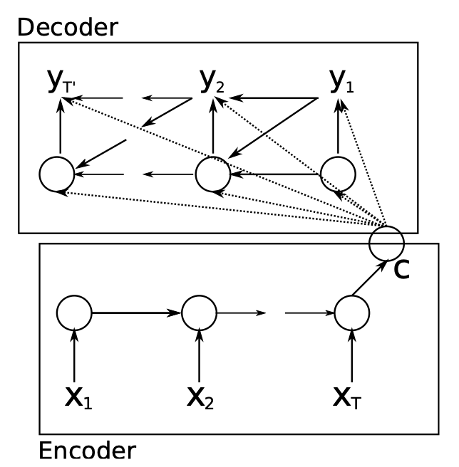 Encoder에서는 input sequence인 X의 embedding vector를 읽으면서 hidden state를 update한다. 예를 들면, "this is great"이라는 문장을 input으로 투입한다고 가정했을때, 첫 번째 입력인 X1는 "this", X2는 "is", X3는 "great"의 embedding vector가 된다. Encoder은 입력들을 받아 hidden state를 update하며, input sequence의 마지막을 알리는 symbol인 EOS(End-Of-Sequence)를 받아 hidden state는 전체 input sequence의 summary인 vector c를 생성한다.