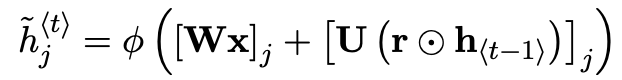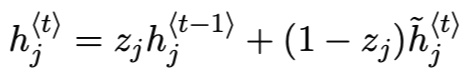 수식에서 ⊙는 element-wise product인 Hadmard product, φ는 tanh activation function를 의미한다. 이렇게 계산된 rj와 zj를 토대로 time step t에 대한 hidden state를 구할 수 있다. 즉, Update gate인 z의 값이 0.3일때 jth element의 t번째 hidden state는 이전 state의 정보를 30%를 넘겨받고 새로운 state의 정보를 70% 수용하게된다.