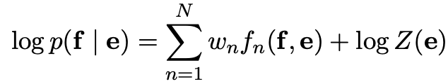 대부분의 SMT는 log p(f|e)를 최대화하는 방향으로 학습을 진행한다. wn는 nth weight을, fn(f,e)는 nth feature을 의미하며, logZ(e)는 normalization constant이다. 이 때 w는 BLEU score를 maximize하도록 optimize된다.