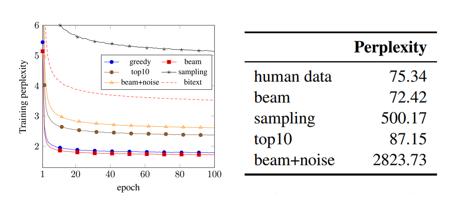 따라서 이렇게 난잡하고 깔끔하지 않은 데이터들을 통해 학습한 모델은 test셋의 데이터가 깔끔하지않아도 학습과정에서 이렇게 '심화된' 문제들을 풀어냈으므로 실제 데이터를 더 정확하게 예측하고있다고 볼 수 있다. 반대로 beam이나 greedy로 생성된 문장은 PPL이 낮고 매우 깔끔한 '쉬운' 문제들이므로 예측력이 떨어진다는 것이다.