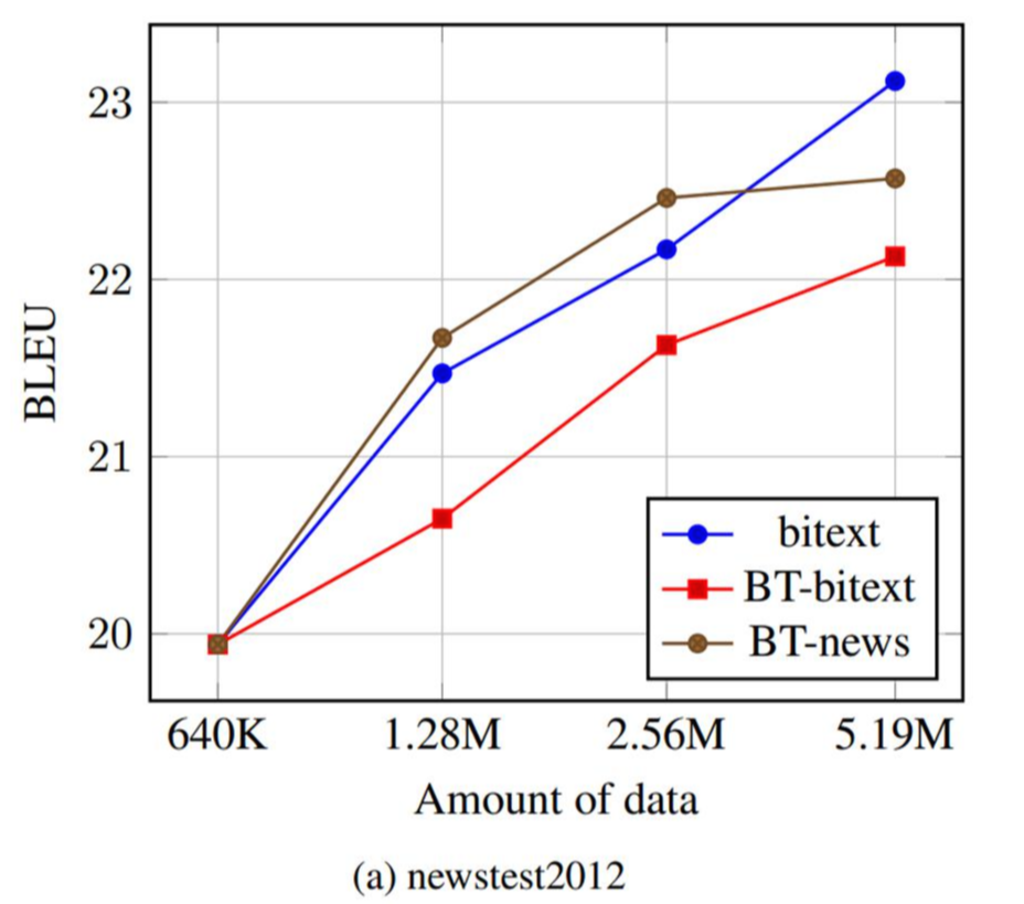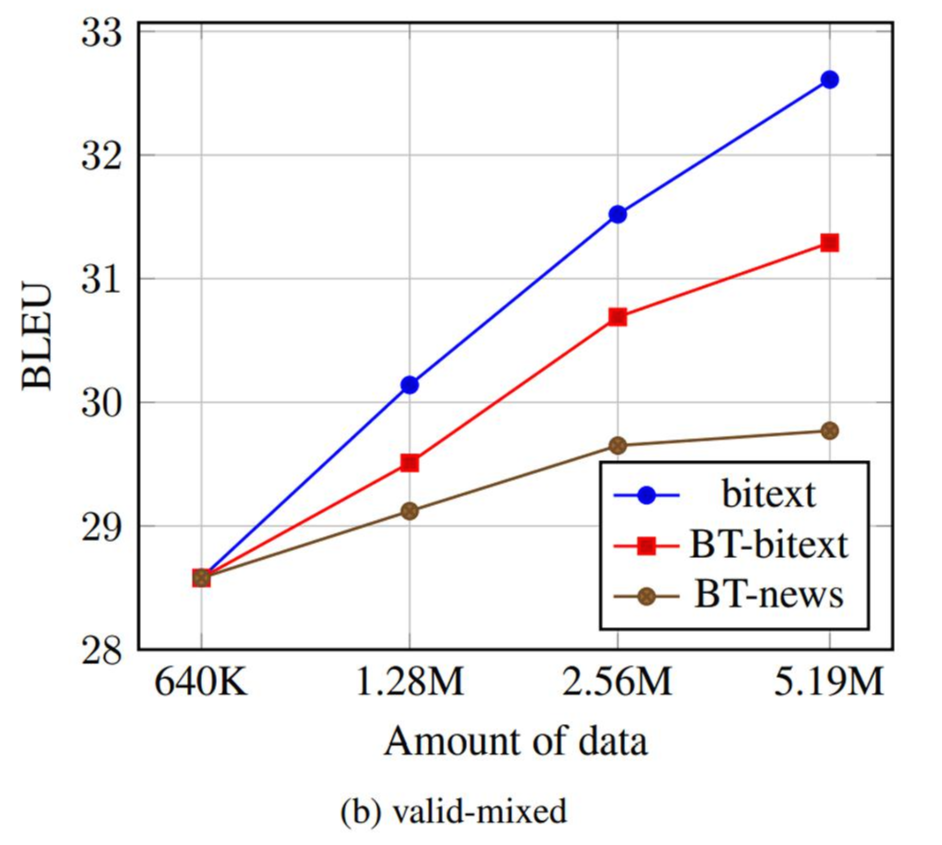추가적으로 이 실험에서 주목할 점은, BT-bitext가 bitext에 비해 낮은 score를 가지긴 하지만 크게 뒤떨어지지는 않는 다는 것이다. 다시말해 64만개의 bitext만 확보가 된다면 500만개의 bitext가 있을때 만큼의 성능과 유사한 성능을 보여줄 수 있다는 것을 의미한다.