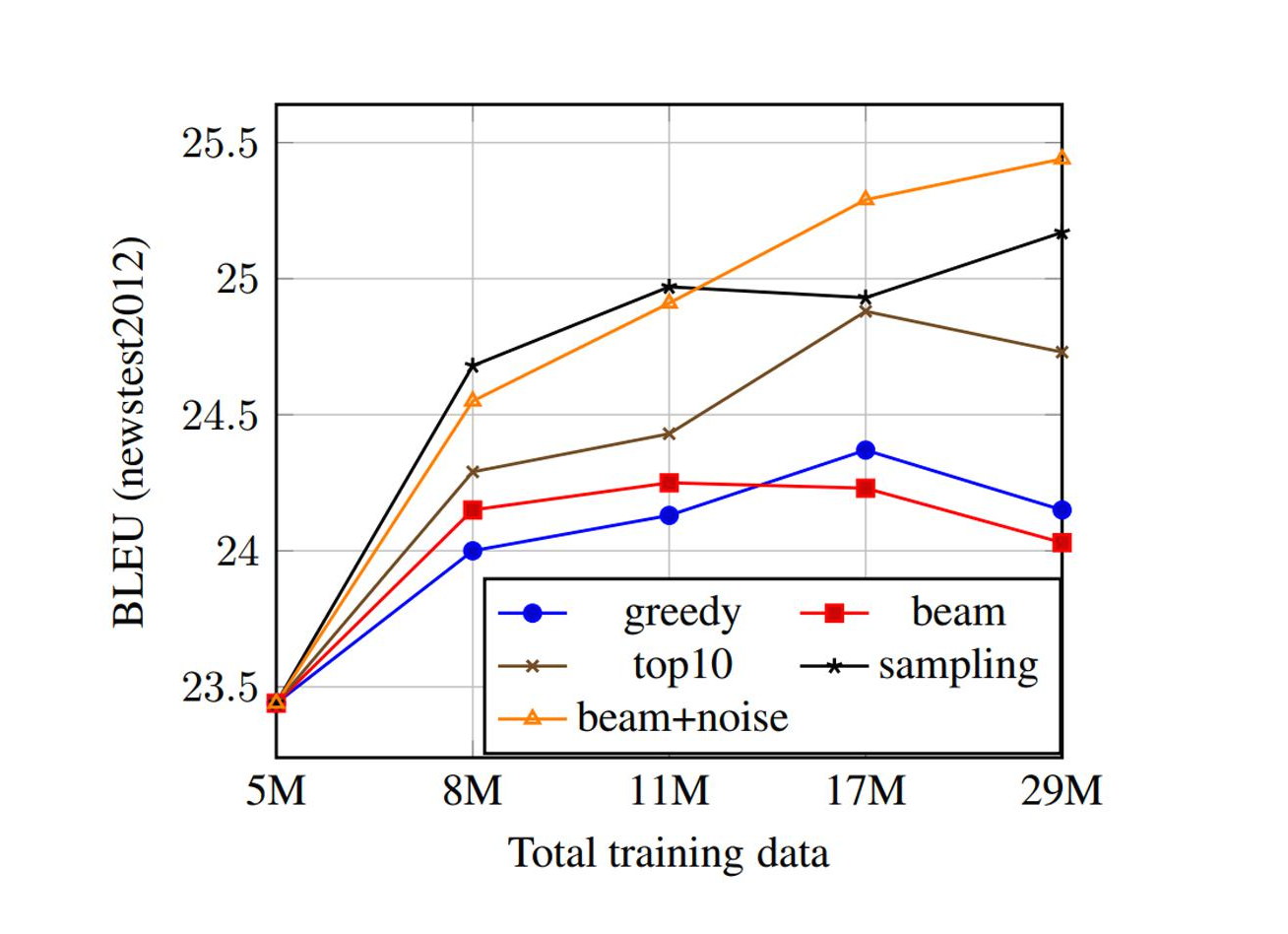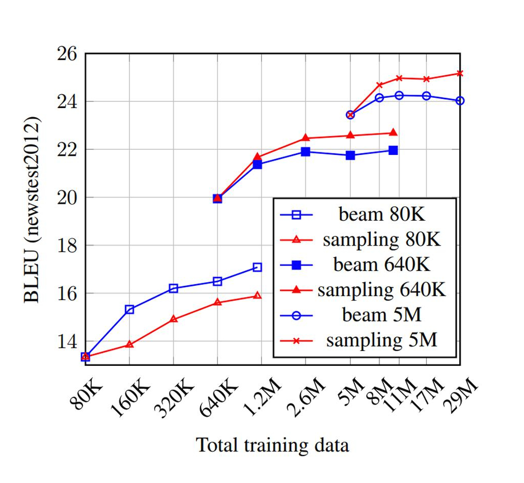 그 결과, sampling은 larger setup, 즉 큰 규모의 데이터가 확보되었을때 큰 효과를 드러냈다. 8만개의 데이터에 있어서는 beam이 월등히 우세하지만, 적어도 64만개의 데이터가 확보되면 그 때부터는 sampling의 방법이 더 효과적이다. 작은 규모의 setup에 있어서는 noise가 학습에 있어서 부정적인 영향을 미쳐 MAP 방법이 더 좋지만 데이터가 충분히 확보되면 그렇지 않다.