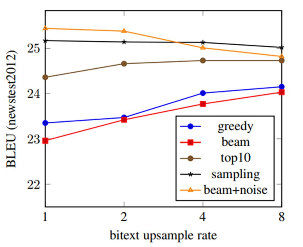 Beam과 greedy는 upsample rate이 증가할 수록 성능이 높아진다. 이는 해당 방법을 통해 생성된 인공 데이터가 bitext만큼의 효과적인 training signal을 제공하지 않기 때문이다. 반면 sampling, beam+noise의 방법들은 upsampling이 오히려 중요하지 않은 것으로 나타난다. 이미 학습과정에서 인공 데이터를 통해 강한 training signal을 제공받아 심화된 학습을 하기 때문에 굳이 실제 데이터를 보지 않아도 좋은 결과를 산출하는 것이다.