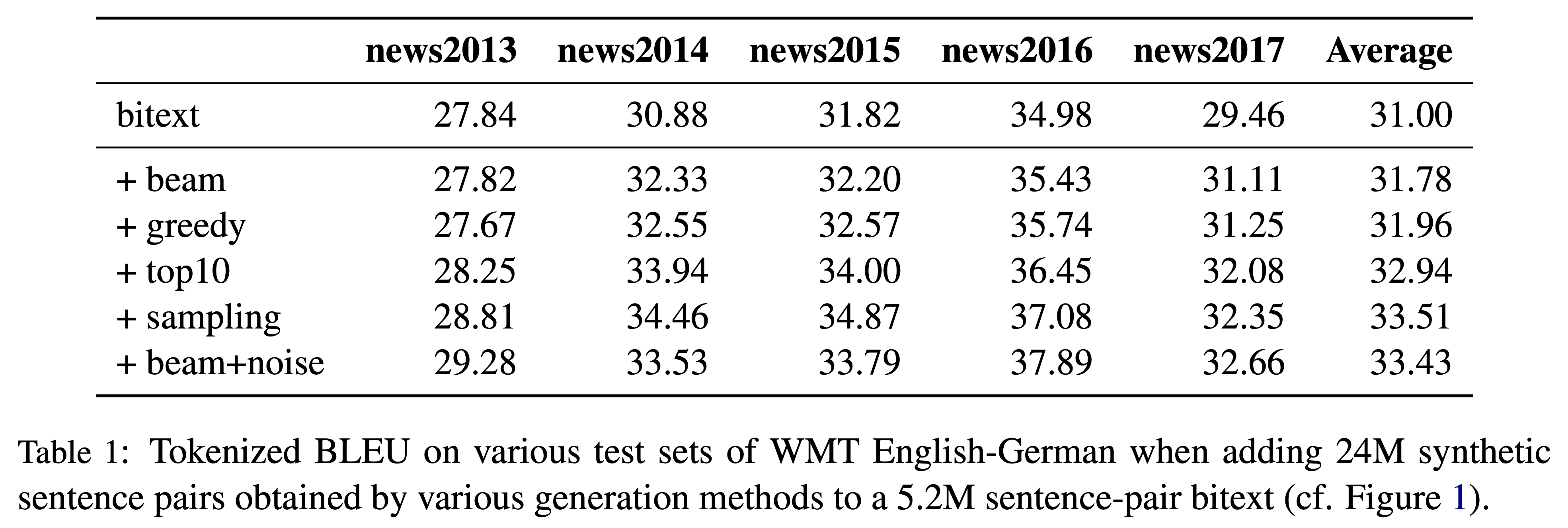 앞선 연구들에서 back translation을 사용할 때, 인공 데이터를 생성함에 있어서 대부분은 Greedy search, Beam search와 같은 MAP(Maximum A-Posteriori) 방법들을 사용해 가장 높은 확률을 갖는 데이터를 생성했다. 하지만 본 논문에서는 Random sampling, Top10-sampling, Beam+noise 등의 Non-MAP 방법에 주목했다.