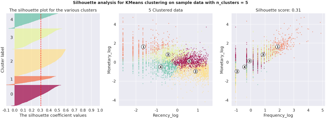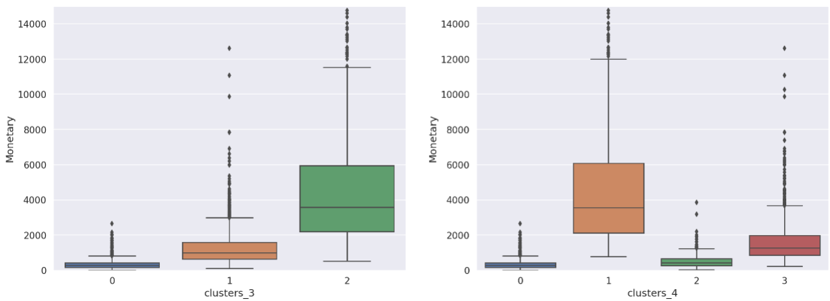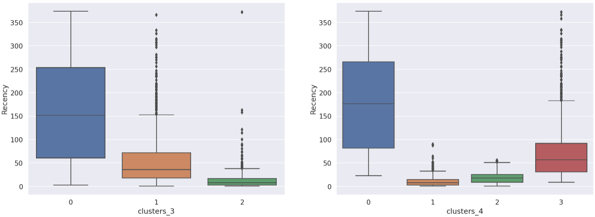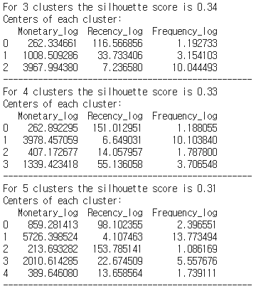 - 0번 군집은 Recency가 타 집단에 비해 상당히 큰 값을 가진다. 극단적인 Recency와 가장 낮은 수준의 Frequency, Monetary는 이탈한 고객들을 대변한다. 해당 군집은 이탈 고객들이 주를 이루는 군집으로 예상된다.