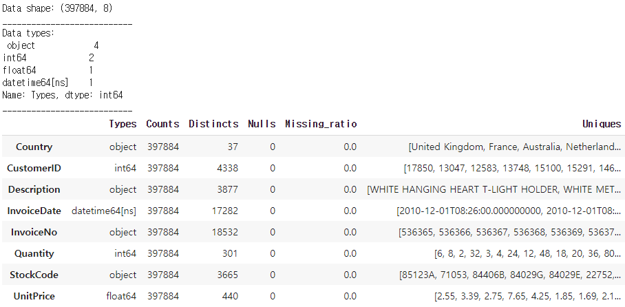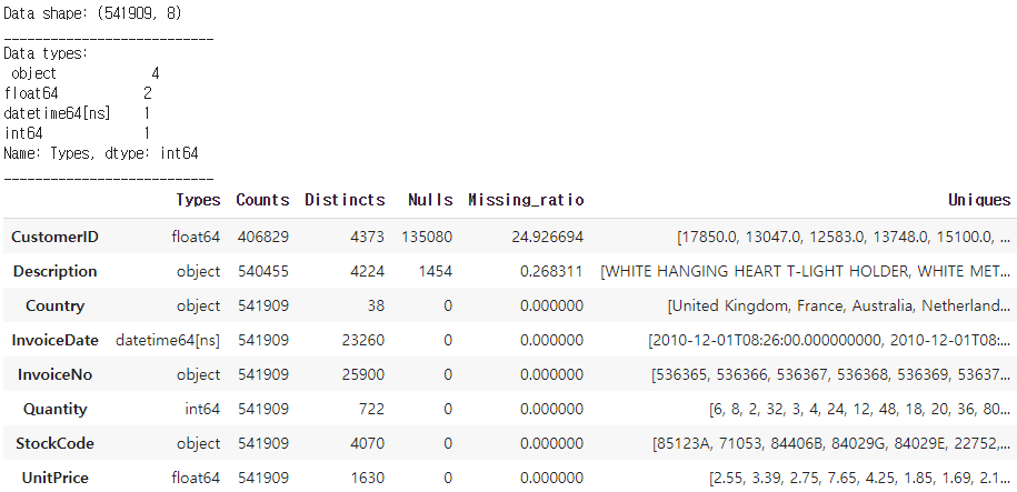 cols = ['Types', 'Counts', 'Distincts', 'Nulls', 'Missing_ratio', 'Uniques']