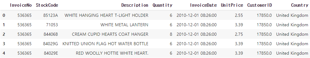 ※ 여기서 주의할점은 한행은 언급했듯이 한건의 구매내역을 나타낸다. 그렇기에 한 고객이 다양한 상품들을 동시에 주문한 경우 InvoiceNo는 해당건들에 대해서 동일한 값을 가진다. 따라서 해당 컬럼을 통해 고객이 동시에 구매했는지 다른시점에 각각 구매했는지 여부를 판단할 수 있다.