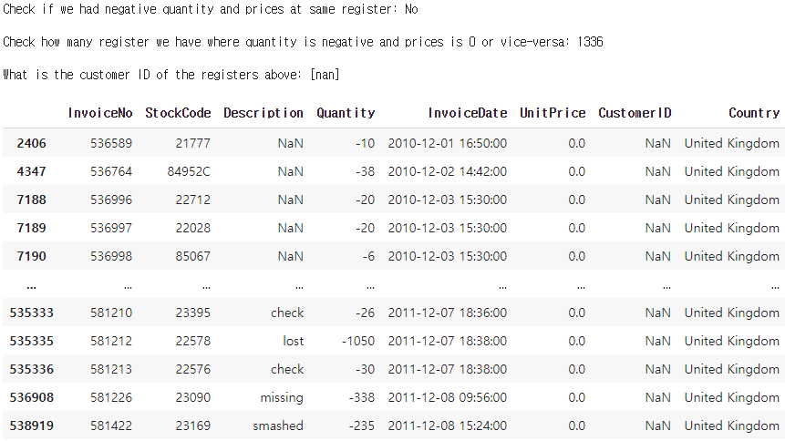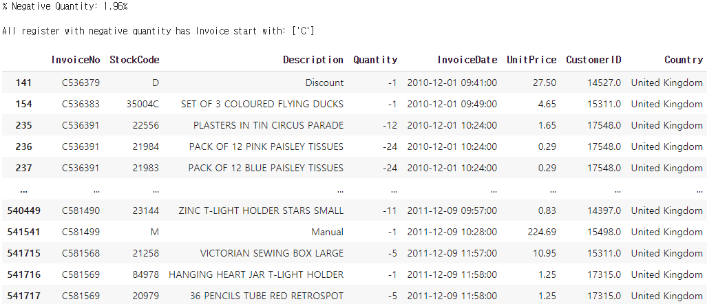 전체 관측치 중 수량이 0미만의 값을 같는 비율은 1.96%로 8905건이 집계되었다. 또한 해당 경우는 CustomerID가 존재하는 경우와 존재하지 않는 경우를 모두 포함하고있는데, 존재하는 경우에는 InvoiceNo는 앞글자가 모두 'C' 로 시작한다. 현재 데이터에 대한 추가적인 정보는 명시되어있지 않아 이것이 무엇을 의미하는지 확신할 수는 없으나, 두가지로 유추해볼 수 있다.