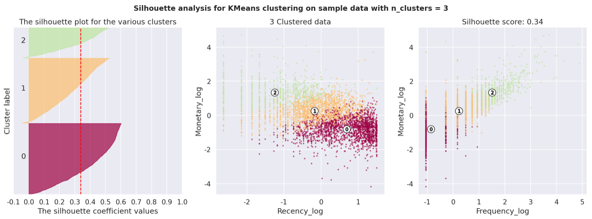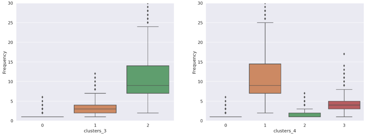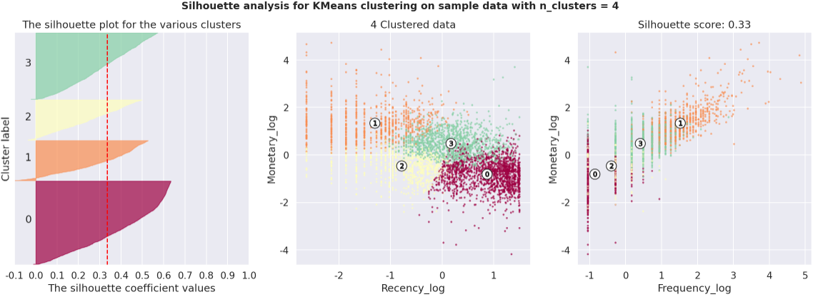 군집의 수가 3일때 보다 4일때 군집이 가지는 고유한 특성이 더 잘 드러나는 양상을 보였다. 3개의 집단에서는 단순히 매출의 기여도에따른 세분화에 주목할 수있었지만, 4개의 집단으로 정의되었을때는 잠재적 고객, 신규고객, 이탈고객 양상 등의 구체적인 행동 패턴이 유추될 수 있었다. 실루엣 계수는 3개의 군집일때가 더 높았으나, 실제 해석과 Insight 창출 및 적용에 있어서 4개의 군집으로 정의하는 것이 더 이상적으로 보인다. 이는 곧 집단별 차별화된 마케팅 전략의 수립, 고객 행동양상 정의 등의 새로운 제안이나 분석으로 이어질 수 있으며 기업차원의 가치창출과 수익창출의 극대화로 직결될 수 있다.
