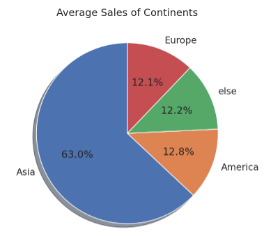 g = plt.pie(market, labels=market.index, autopct='%.1f%%', shadow=True, startangle=90)