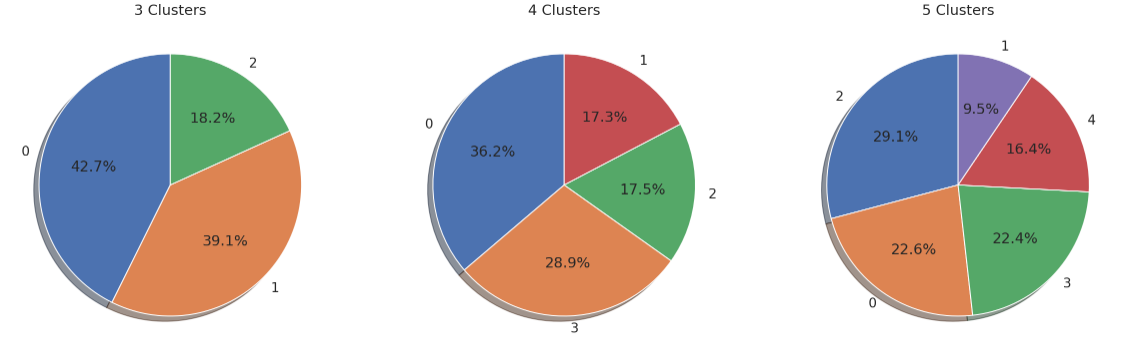 이에따라 K = 3, 4, 5에 따라 형성된 Silhouette Score를 살펴보면 값은 모두 비슷하다. 언급했듯이, 계수의 균일성은 매우 중요한 요소인데 해당 함수에서는 붉은 선위의 군집별 면적이 이를 의미한다. 즉, 붉은 선보다 우측에있는 그래프의 면적이 군집간의 균일할 수록 군집이 타당하게 형성되었다고 볼 수 있다. 이러한 관점에서 K = 3, 4 인 경우가 5일때에 비해서는 적절하게 군집이 형성되었다고 판단했다.
