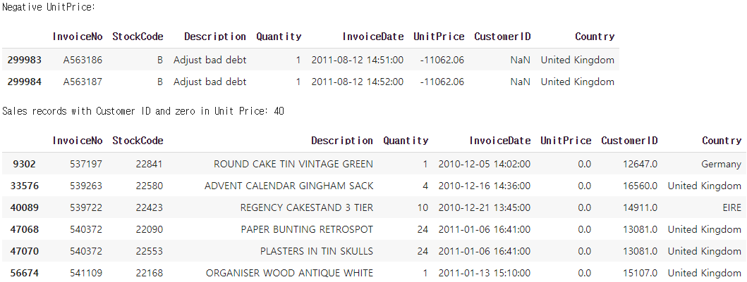 개별단가가 0 미만인 경우는 총 2건이며 CustomerID는 존재하지않는다. 해당 품목은 'Adjust bad debt' 로 불량 부채조정을 의미한다. 해당 건은 상품에 대한 구매라고 보기어려우며 기업내부의 정책적인 조정에 의해 지출된 금액으로 파악된다. Price역시 타상품들에 비해 월등히 높은 값을 가진다. 소비자들의 구매가 주를 이루는 데이터에서 해당 두 행은 적합하지 않은 것으로 판단되며 추후 제거가 필요하다. 다음으로 개별단가가 0미만 일때 고객 ID가 존재하는 경우는 40건으로 집계 되었다.