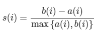 두 군집 간의 거리 값은 b(i) - a(i) 이며 이 값을 정규화 하기 위해 Max(a(i),b(i)) 값으로 나눈다.