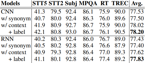 해당 방법의 검증을 위해 데이터셋은 SST5, STT2, Subj, MPQA, RT, TREC 을 사용했으며 LSTM-RNN, CNN에 dropout을 적용한 모델에 각각 3가지 augmentation을 적용해 성능을 비교했다.