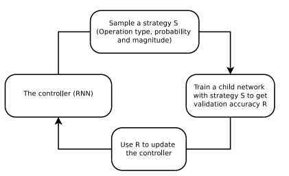 Controller는 reward signal에 의해 학습한다. Random하게 선택된 sub-policy를 적용한 train set을 search process의 일부인 child model이 학습하며, validation set에서의 accuracy의 증감에따라 reward signal이 발생한다.