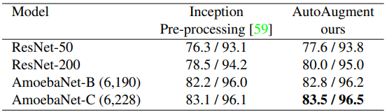 마지막으로 ImageNet에서도 reduced dataset을 구성해 policy를 선정했으며 CIFAR-10과 유사하게 color-based policy들이 주로 선정됐다. AmeobaNet-C model이 83.5 / 96.5(%)로 sota를 달성했으며 타 모델들에서도 유의미한 성능 개선이 이뤄졌다.