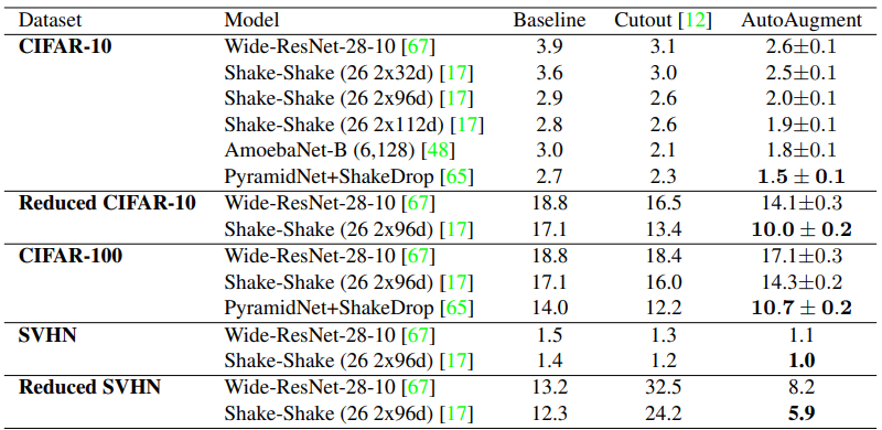 약 4,000 여개의 데이터를 가지는 reduced CIFAR-10을 이용해 best policy를 선정한 결과, 주로 color-based tranformation이 선정되었다. 반대로 geomatric한 특성을 가지는 ShearX, ShearY는 좋은 policy로 선정되지 않았다. 또한 Invert의 경우는 아예 제외되었다. 이를 기반으로 ResNet, Shake-Shake net등의 여러 모델에 적용해 정확도를 비교한 결과 Shake-drop 모델은 error rate 1.5%를 기록하며 기존의 sota를 0.6% 능가하는 결과를 보여주었다.
