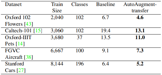 다음으로 AutoAugment가 특정 domain에만 과적합되는 것이 아니라 범용적으로 사용이 가능하다는 일반화의 가능성을 평가하기위해 ImageNet에 선정되었던 best policy들을 매우 작은 규모를 가진 5개의 dataset에 적용했다. 위 결과대로 baseline보다 우수한 결과를 얻었고 Stanford Cars dataset에서는 sota를 달성했다. 즉 이는 특정 도메인에 적절한 DA들을 찾지만 과적합되지는 않은 높은 보편성을 보여준다.
