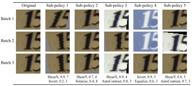 해당 dataset은 앞선 두 데이터와 달리 글자가 적힌 image dataset에 해당한다. 전과 유사하게 1000여개의 데이터를 가지는 reduced SVHN으로 best policy를 선정했으며 사용한 child model 역시 동일하다. 그 결과 CIFAR-10에서는 color-based 방법이 주로 선정된 반면에 여기서는 Invert, Equalize, ShearX/Y, Rotate 가 가장 빈번하게 나타났다. 숫자의 색상이 분류에 중요한 영향을 미치지 않는다는 것은 상식에도 부합하는 점으로 볼때 결정된 policy들에 대한 설명이 가능하다. 다시말해, AutoAugment를 통한 policy의 선정이 general한 feature들을 잘 표현하고 있는 것으로 이해할 수 있다.