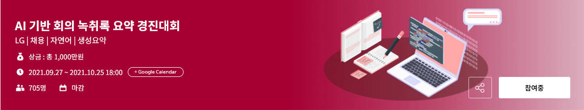 해당대회는 LG에서 주최한 대회로 정형화된 형태의 회의록이 주어지고, 이를 토대로 적절하게 요약하는 대회였습니다. 요약에는 크게 원본 텍스트에서 주요문장을 추출하는 추출요약(Extractive summarization)과 생성요약(Abstractive summarization)으로 나뉩니다. 대회에서는 원본 텍스트를 기반으로 새로운 형태의 문장을 구성하는 생성요약을 해내는 대회였습니다.