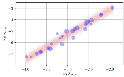 Darmstadt Noise dataset의 shot and read noise에 해당하며, noise parameter의 선정을 위해 붉은 선에 해당하는 distribution으로 부터 shot, read noise를 무작위 sampling을 통해 선정했다.