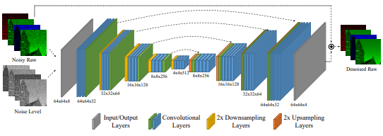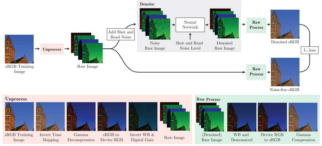 본 논문에서는 이러한 문제를 실제와 거리가 먼 인공 학습데이터를 사용하기 때문이라고 가정하는데서 출발한다. 이전의 algorithm들은 noise가 additive, white, gaussian하다고 가정하는데 이는 실제와 부합하지 않는다. 이를 극복하기위해 image processing의 과정을 단계적으로 역변환하는 'unprocess'의 방안을 제시했다. 부가적으로 loss function을 평가할때는 processing에 관련된 요소들을 고려한 모델을 구성함으로써 denoising 후에 발생하는 광학적인 부분들을 학습시 고려하도록 했다.