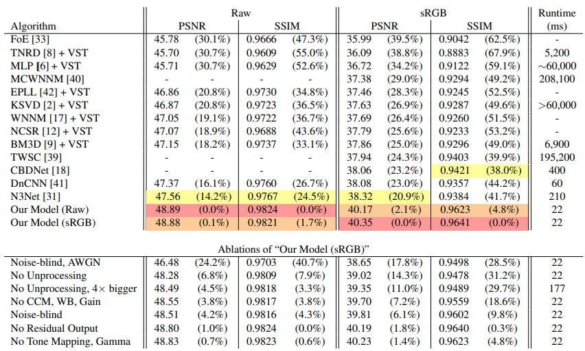 PNSR, SSIM metric을 통해 평가한 결과, 이전의 여러 algorithm과 비교했을 때 가장 높은 성능을 보여준다. 표에서 제시된 결과는 raw 또는 sRGB를 input으로 사용하여 나온 output에 대한 결과이다. 일부 모델들('-'로 결과가 표시)은 sRGB를 input으로 받을 시에 raw 형태로의 평가는 제한적이므로 결과가 생략되어있다. 또한 오류 감소율도 표기되었는데, 이는 PSNR을 RMSE로 SSIM을 DSSIM으로 변환한 상대적인 error 감소율을 의미한다.