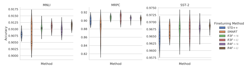 SST-2, QNLI, QQP, RTE 순으로 학습함에 따라 accuracy의 변화가 나타나는 것을 볼 수 있는데, R4f를 적용한 경우가 일반적인 경우보다 그 저하 폭이 훨씬 작은 것으로보아 representation을 더 잘 보존하고있음을 나타낸다.