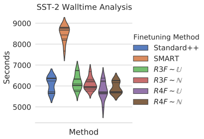 실험은 크게 sentence prediction과 summarization task에 대해 기존에 제시된 fine tuning 방법들, 이를테면 SMART와 FreeLB와의 시간, 성능 측면에서의 비교에 초점을 맞췄다.