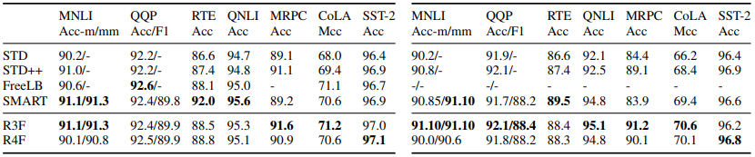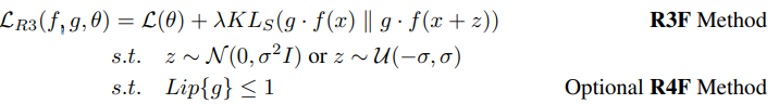 SMART는 부가적인 backward computation이 필요하여 연산량이 커지는 단점이 있어, 저자들은 다른 방법을 제시했다. SMART로부터 adversarial nature를 제거하는 대신 KLs의 smothness를 최적화했다. 또한 g(f(x))에서의 g에 최대 1-Lipschitz만큼 제한함으로써 추가적인 제약을 부가하여 더 효과적으로 f를 제한했으며 z로 표현되는 noise function은 noraml, uniform distribution을 사용했다. 언급한 추가적인 제약을 부여한 방법을 R4f, 그렇지 않은 경우를 R3f라고 칭한다. 해당 방법은 adversarial nature를 제거함으로써 연산적인 부하를 감소시키며, g를 smotohing함으로써 g(f(x))의 최적화를 더 용이하도록 만든다.