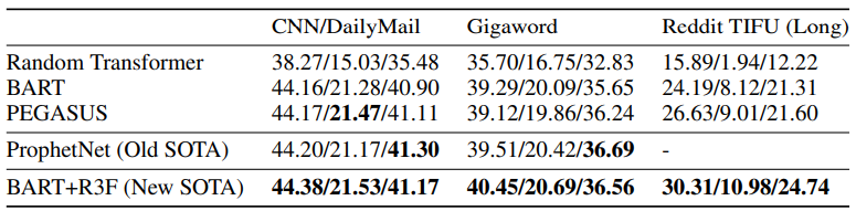 다음으로 summarization task에서는 sota를 달성했다. CNN/Dailymail, Gigaword, RedditTIFU를 사용했다. 해당 task는 generation task로 classification head에 해당하는 g function이 없어 R4f는 적용이 불가능하며 R3f에 label smoothing loss를 적용했다. 그 결과, 기존의 PEGASUS나 ProphetNet을 큰 차이로 능가하는 새로운 sota를 달성했다.