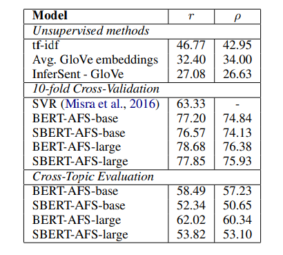 10-fold CV의 경우, BERT와 SBERT는 비슷한 수준을 보여준다. 하지만 cross-topic의 경우 SBERT는 현저하게 성능이 저하되었다. BERT는 pair문장을 구분하기 위해 attention을 사용하는 반면, SBERT는 각각의 문장을 알지 못하는 topic으로 부터 vector space에 mapping 해야하기 때문에 더 어려운 문제라고 보여진다.
