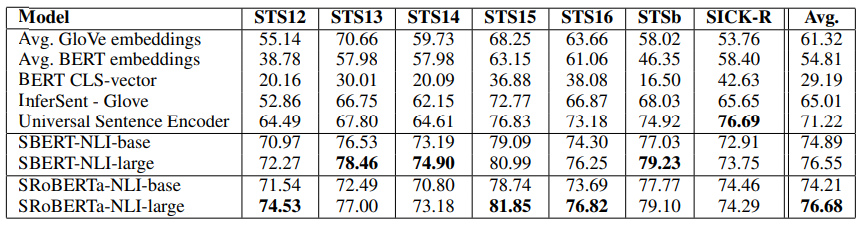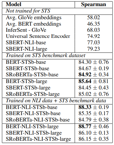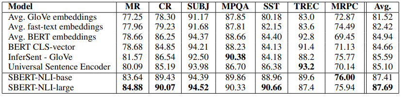 물론 이러한 전이학습의 방식이 SBERT sentence embedding의 목적에는 부합하지 않지만, 결과적으로 sota나 그에 준하는 성능을 달성했다. 즉, SBERT의 sentence embedding이 여러가지 정보들을 잘 capture하여 semantic feature를 보존하고 있다고 할 수 있다.