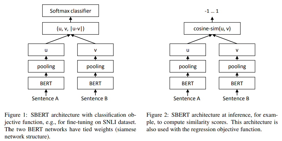 SBERT는 siamese network의 구조로 사전학습된 BERT 또는 RoBERTa에 고정된 vector를 출력하도록 하는 pooling operation을 추가한 형태다. 두 개의 input을 동시에 받아, 동일한 parameter를 갖는 BERT를 거쳐 pooling layer를 통해 각각의 fixed size sentence embedding에 해당하는 u, v를 반환한다. 해당 vector들을 이용해 objective function을 적용하면 classification, regression과 같은 다양한 task에 접목이 가능하다.