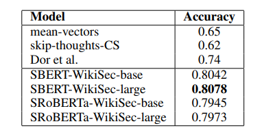앞선 두가지 task와 다르게 해당 task에서는 triplet objective function을 사용한다. 같은 section으로부터 나온 anchor, positive example이 negative example보다 anchor에 가까운 경우는 1, 아닌 경우는 0으로 구분되는 classification에 해당해 metric은 accuracy이다. SBERT가 BILSTM, skip-thoughts 보다 월등히 우수한 것을 볼 수 있다.