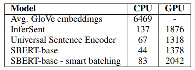 이를 극복한 SBERT는 sentence embedding의 측면에서 좋은 representation을 갖고있다는 것을 입증했다. 동시에 연산적인 측면에서도 매우 효율적이다. InferSent나 Universal Sentence Encoder 보다도 매우 우수한 속도를 갖고있으며 이는 GPU 환경에서 극대화된다. 또한 기존의 BERT로는 수행이 어려운 clustering과 같은 task를 매우 효율적으로 수행할 수 있다는 장점을 가진다.