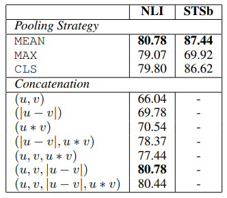 가장 좋은 pooling strategy는 MEAN이며, concatenation은 (u, v, |u-v|)인 경우이다. 특히 concatentation에서 가장 중요하게 작용하는 요소는 element wise difference인 |u-v|의 존재 여부이다. 해당 요소는 두 문장에 대한 차이를 거리적으로 측정하기 때문에 유사한 pair는 가깝게, 그렇지 않은 pair는 멀다는 정보를 내포하고 있어 중요한 역할을 한다.
