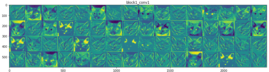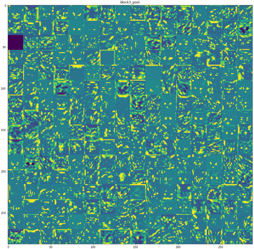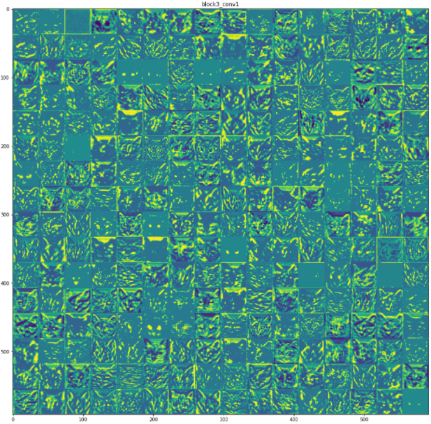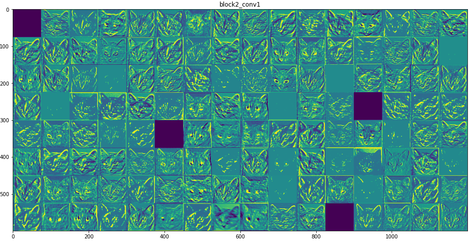 Layer가 깊어짐에 따라 고양이 사진이 사람이 식별하기 좀더 어려운 형태로 점차 변형되고있다. 특히 위 모델에서는 Max Pooling을 통해 이미지의 edge를 잡아내고 특성을 추출하는데 이에 따라 block1에서 block3로 갈수록 특정 필터에서는 귀, 눈, 코, 전체적인 이미지 실루엣 등의 특징적인 부분을 포착하여 필터에서 학습하고 있음을 보여준다. Max Pooling은 이러한 특징점 추출에 기여하고있다. 시각화에서 알 수 있듯이 CNN은 각각의 필터가 이미지의 고유한 특징적인 부분을 capture하는 방식으로 학습을 진행한다. 정리하자면, 층에서 추출한 특성은 층의 깊이를 따라 점점 더 추상적으로 학습된다. 상위 층의 활성화는 특정 입력에 관한 시각적 정보가 점점 줄어들고 target에 관한 정보가 점점 더 증가하는 방향으로 학습이 진행되는 것으로 보인다.