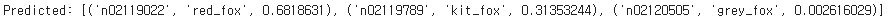 새로운 image인 여우 이미지에 대해 VGG16 모델은 red_fox를 1순위로 선정했으며 당시 확률은 0.68이 산출되었다.