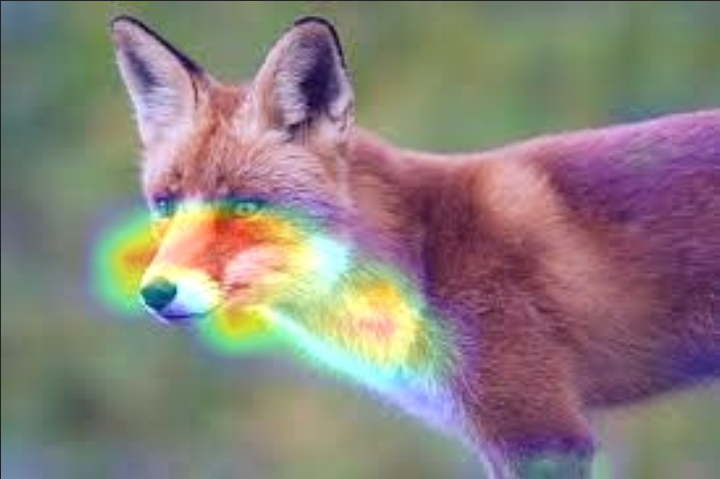 모델의 마지막 Convolution Layer인 'block5_conv3' 를 back-propagation하여 얻어낸 gradient를 통해 feature map을 heatmap형태로 표현하고 이를 보기좋게 원본사진과 겹쳐서 표현하면 위와같은 사진이 산출된다. 즉 붉은 여우를 탐지하는 데에 있어서 해당 여우의 목부분과 특히 튀어나온 코부분이 분류에 상당히 큰 기여를 하고 있음이 드러난다.