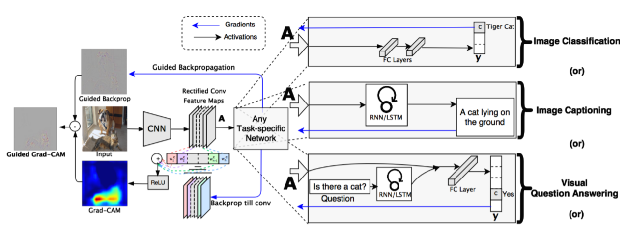 하지만 2016년 'Grad-CAM : Visual Explanaitions from Deep Networks via Gradient based Localization' 이라는 논문이 발표되면서 Network의 중간층에 대한 시각화와 최종 분류결정요인에 대한 시각화가 가능해졌다. 간단히 논문에서 사용한 방법에 대해서 설명하자면 'Grad-CAM' 이라는 방법을 사용했다. 이 방법은 기존 모델의 구조에서 특별한 변형없이 성능을 유지한채로 어느정도 해석이가능한 시각화된 자료를 제공한다. Convolutional layer에서의 gradient를 활용해 Convolutional layer's feature maps과 곱연산하여 추가적으로 ReLU Activation function을 거친 값을 input이미지에 heat-map표현을 해주는 것으로 Grad-CAM을 표현할 수 있다.